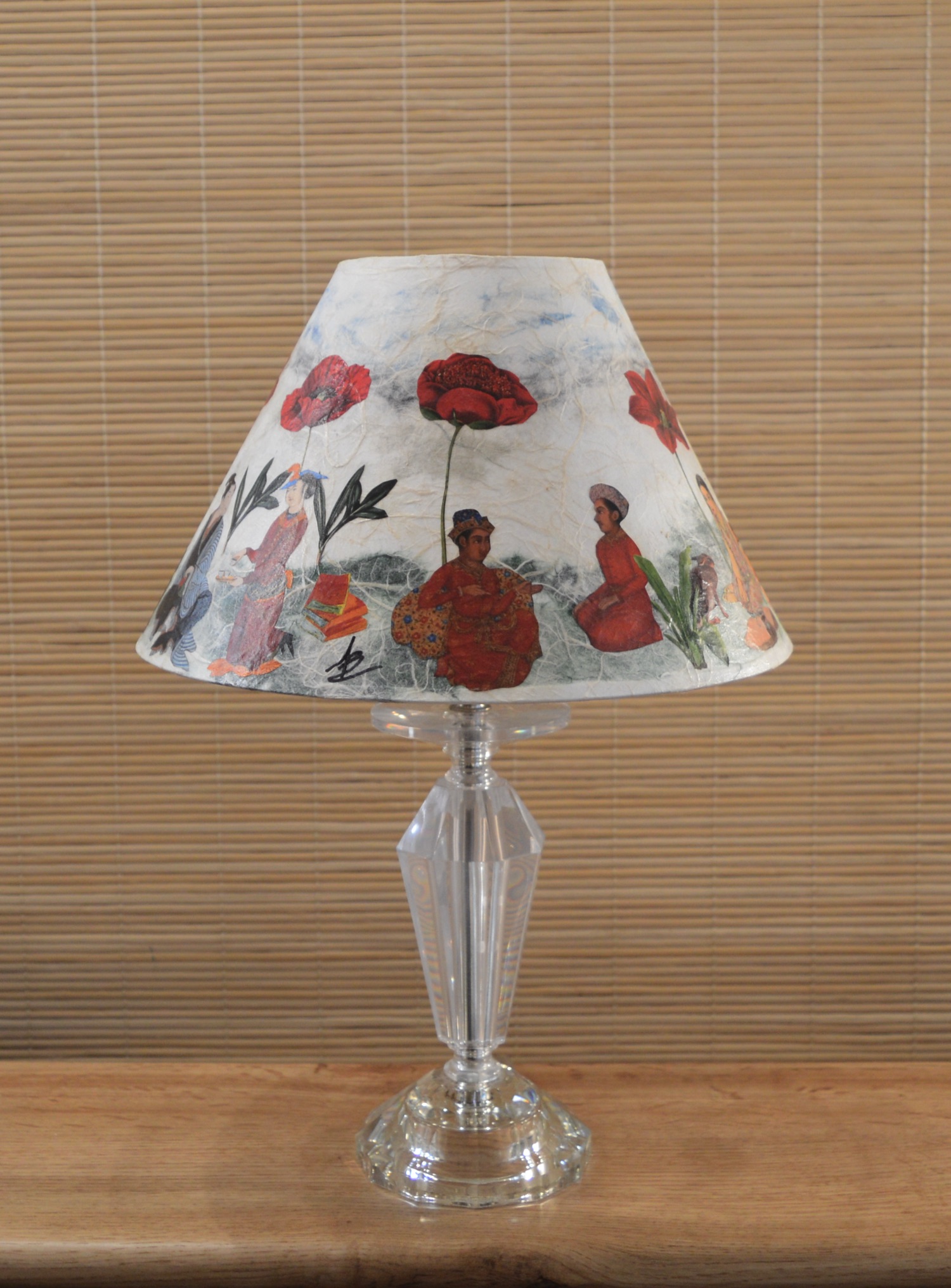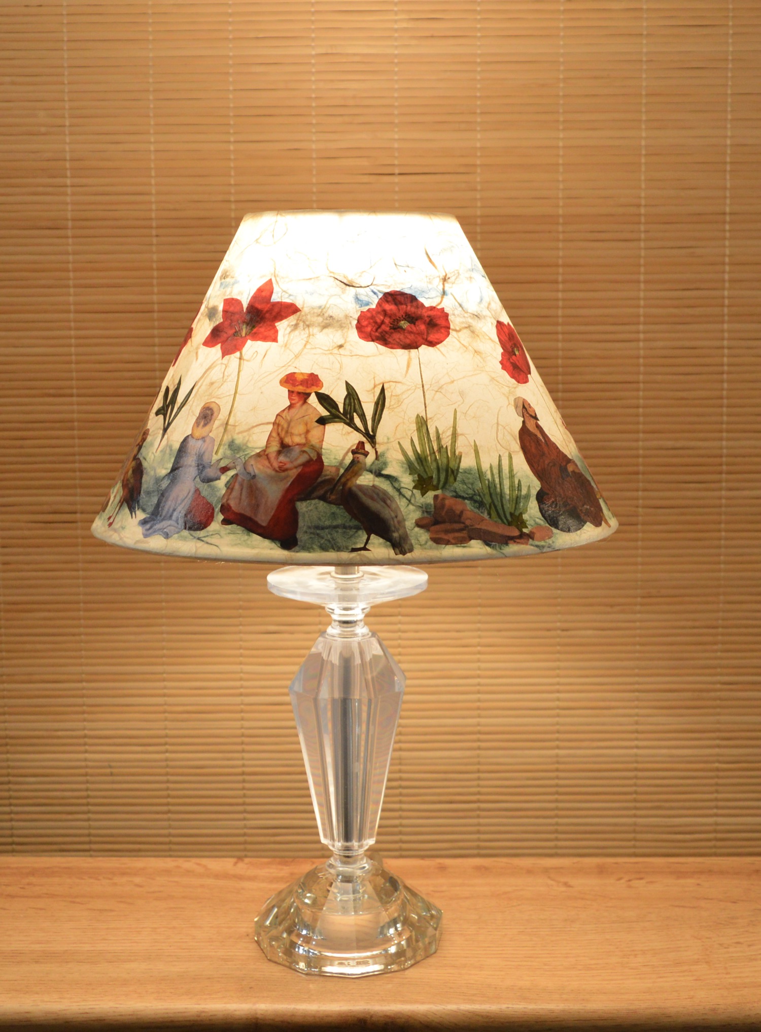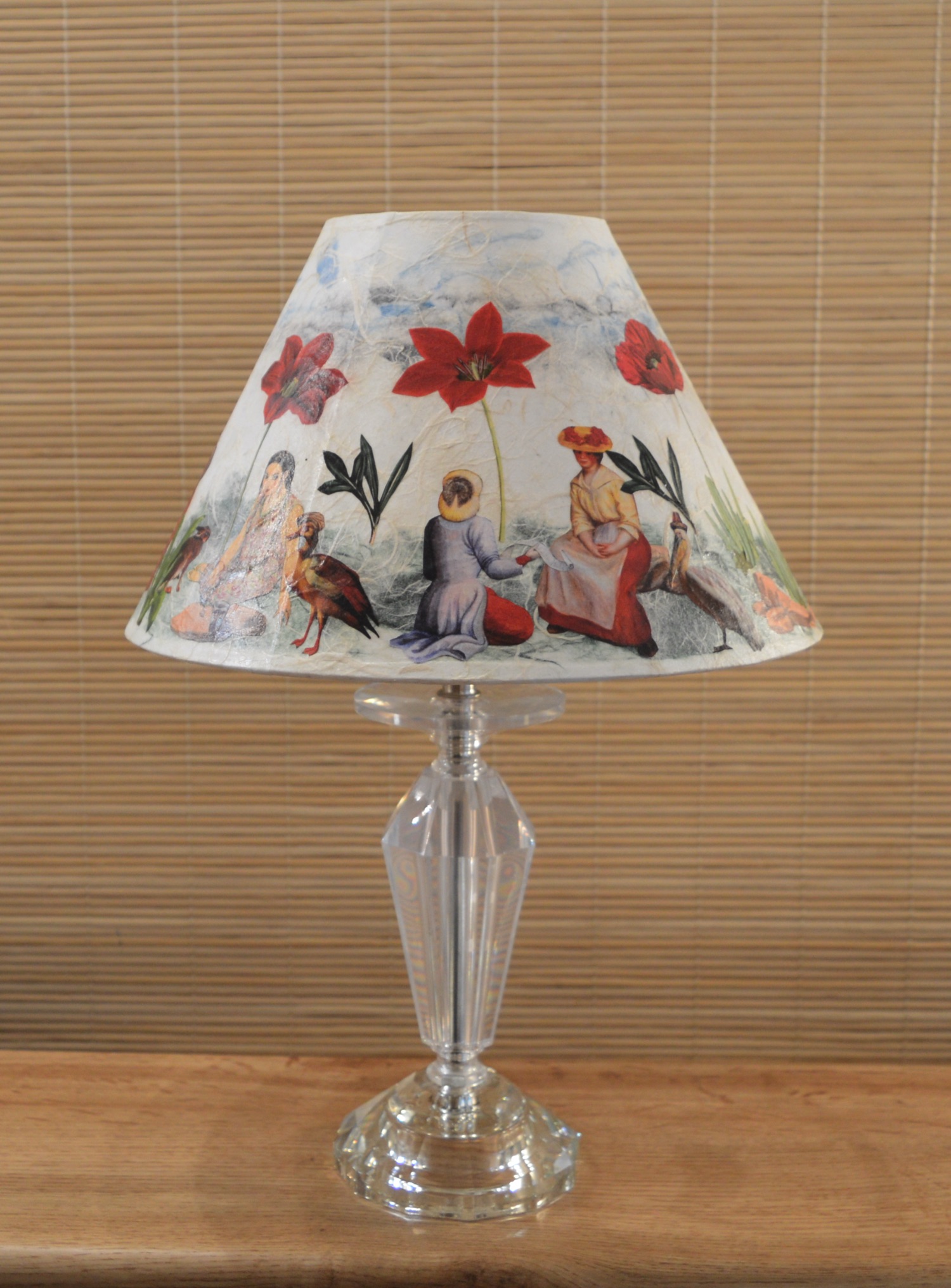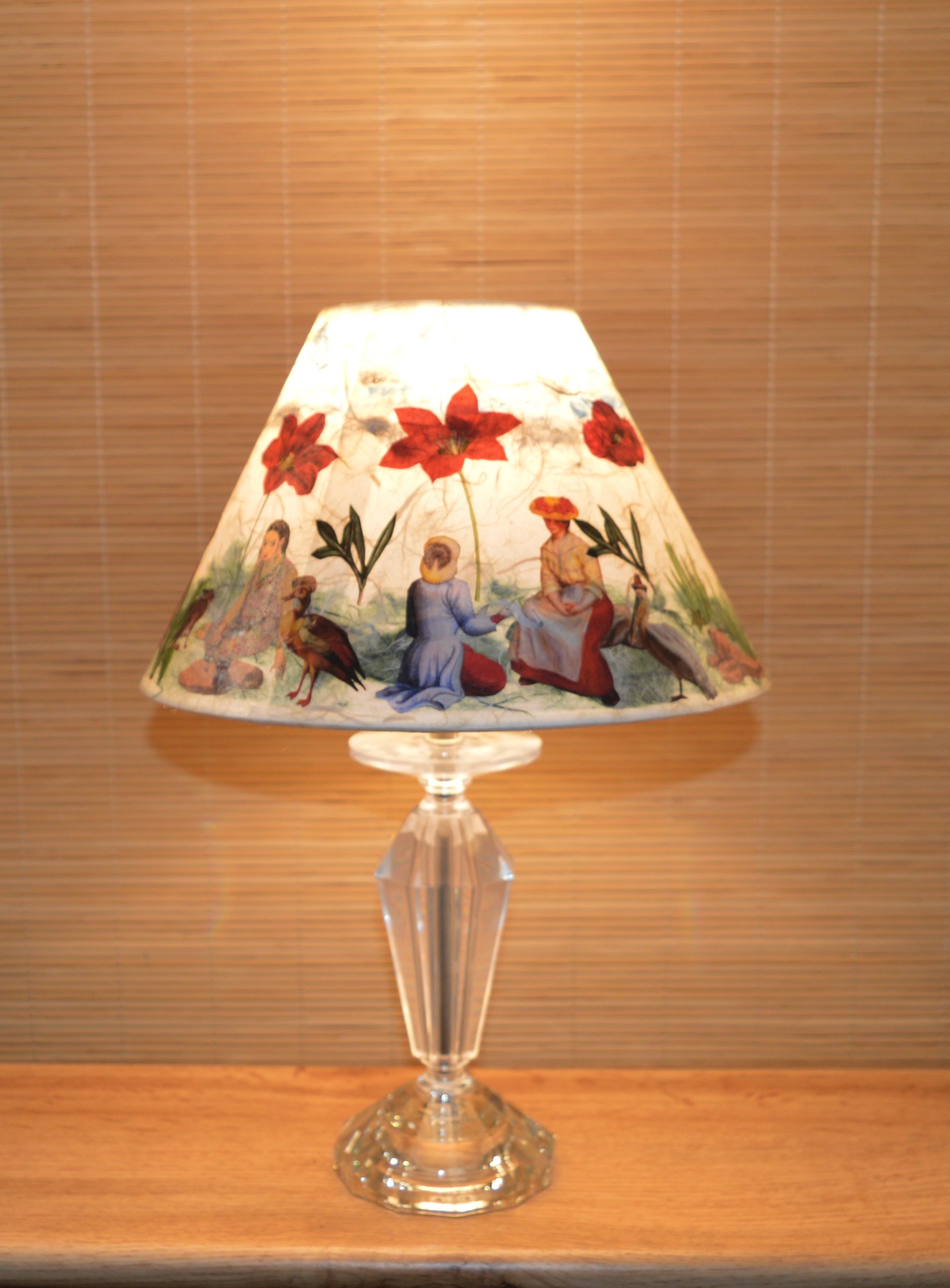 Sur cet abat-jour j'ai placé des extraits de peintures des quatre coins du monde dans des périodes très différentes, les siècles permettent de voyager au travers du temps, les rencontres, les découvertes culturelles et artistiques sont le fil conducteur de cette collection.