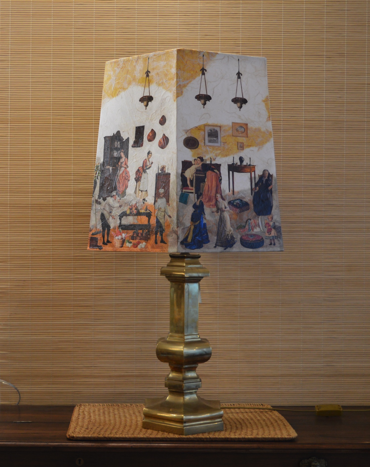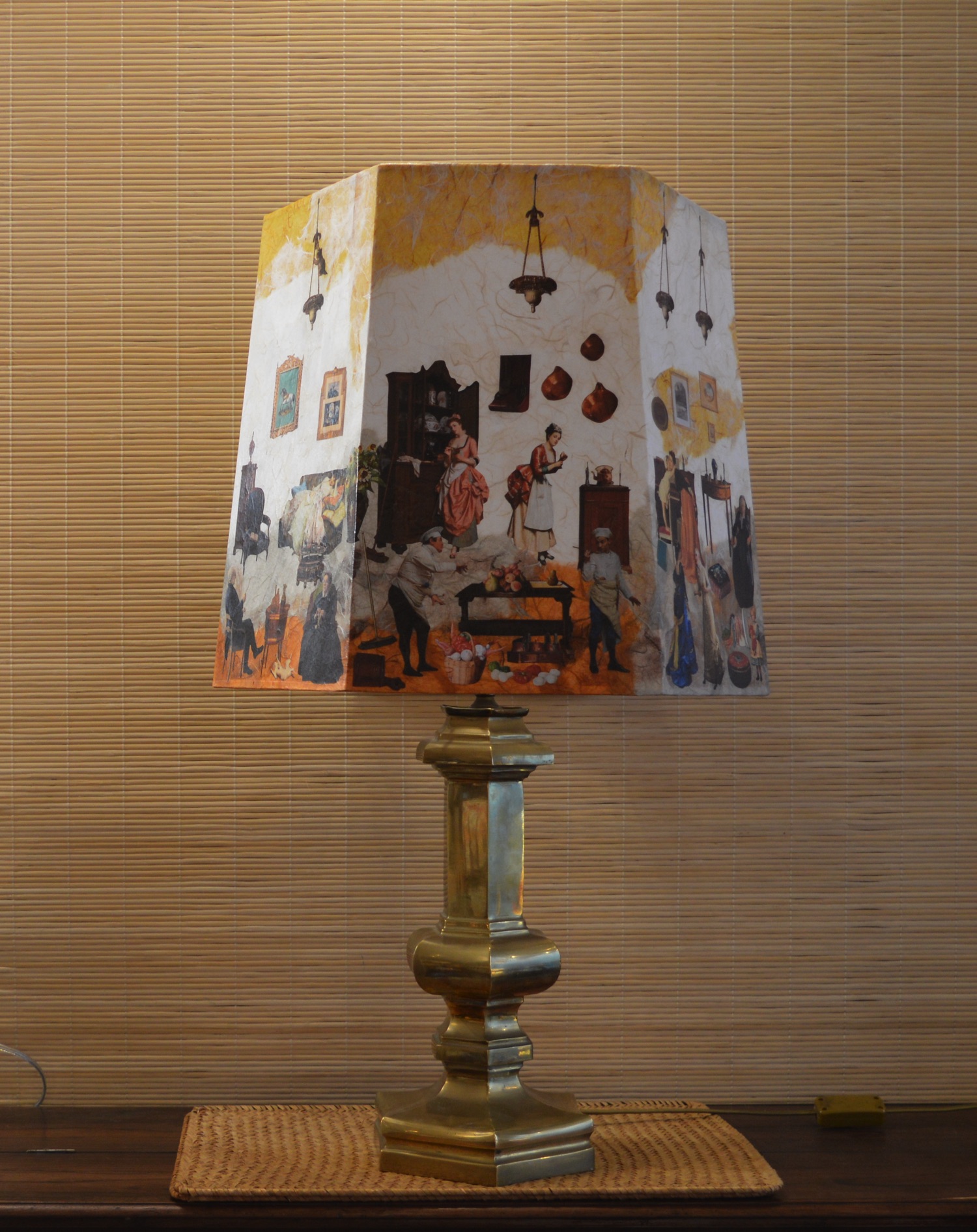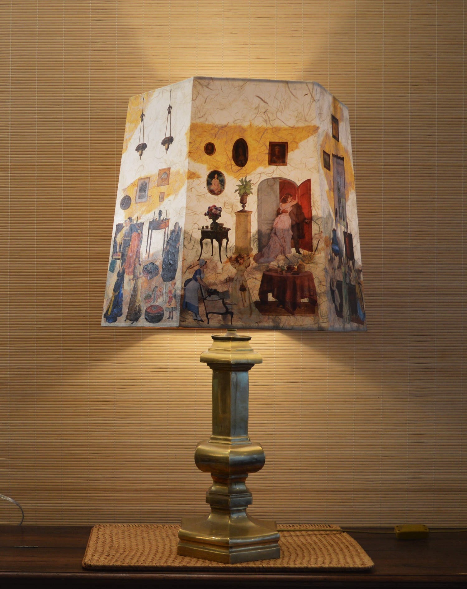 Grand abat-jour 6 pans qui représente six pièces de vie, la cuisine ou les gens de maison s'affairent,