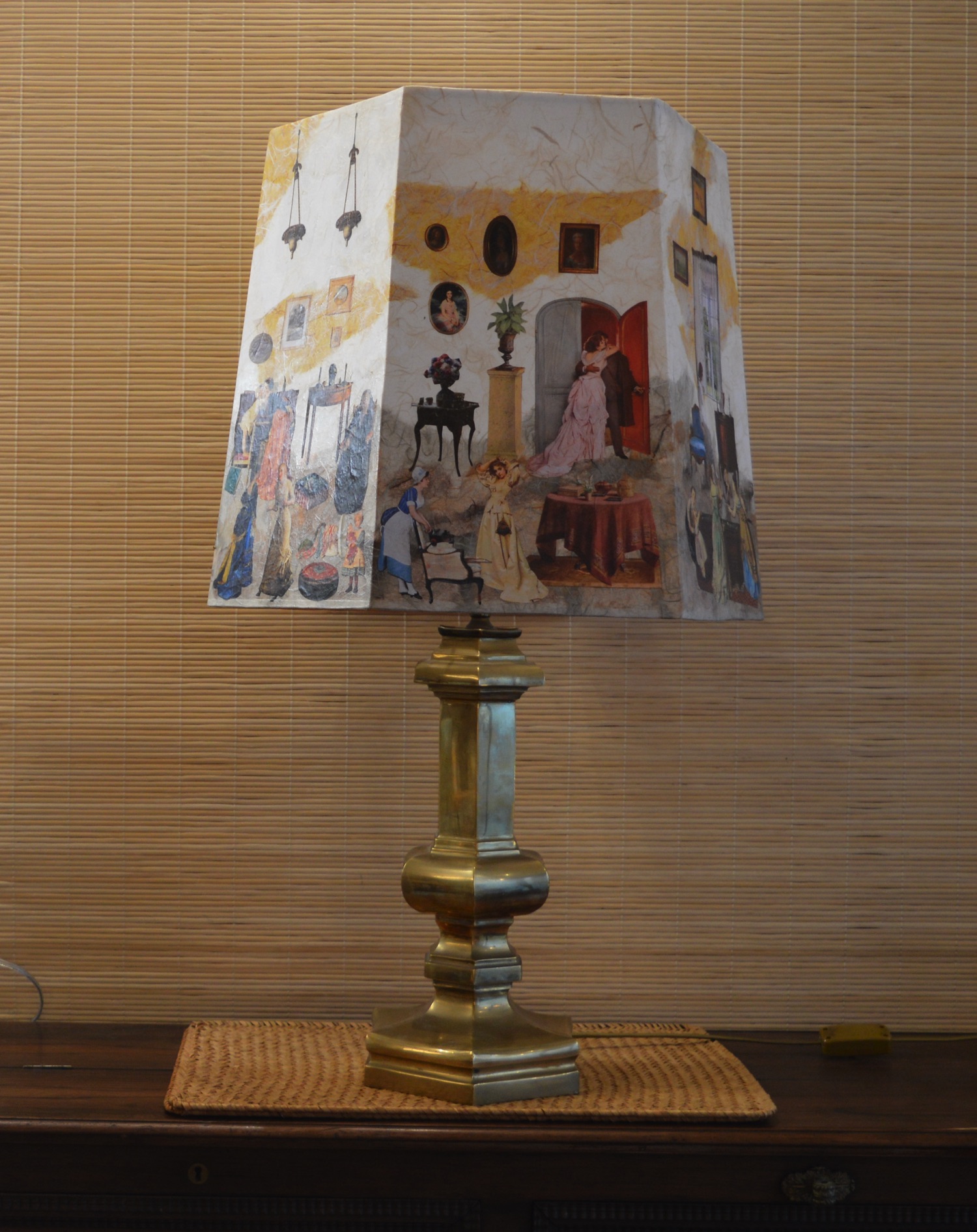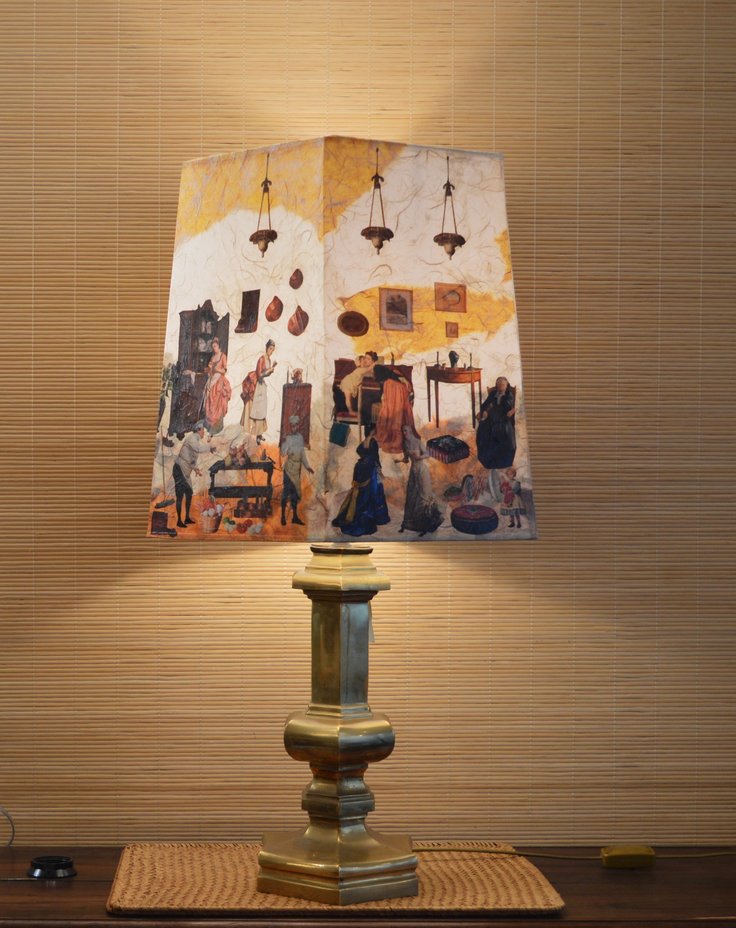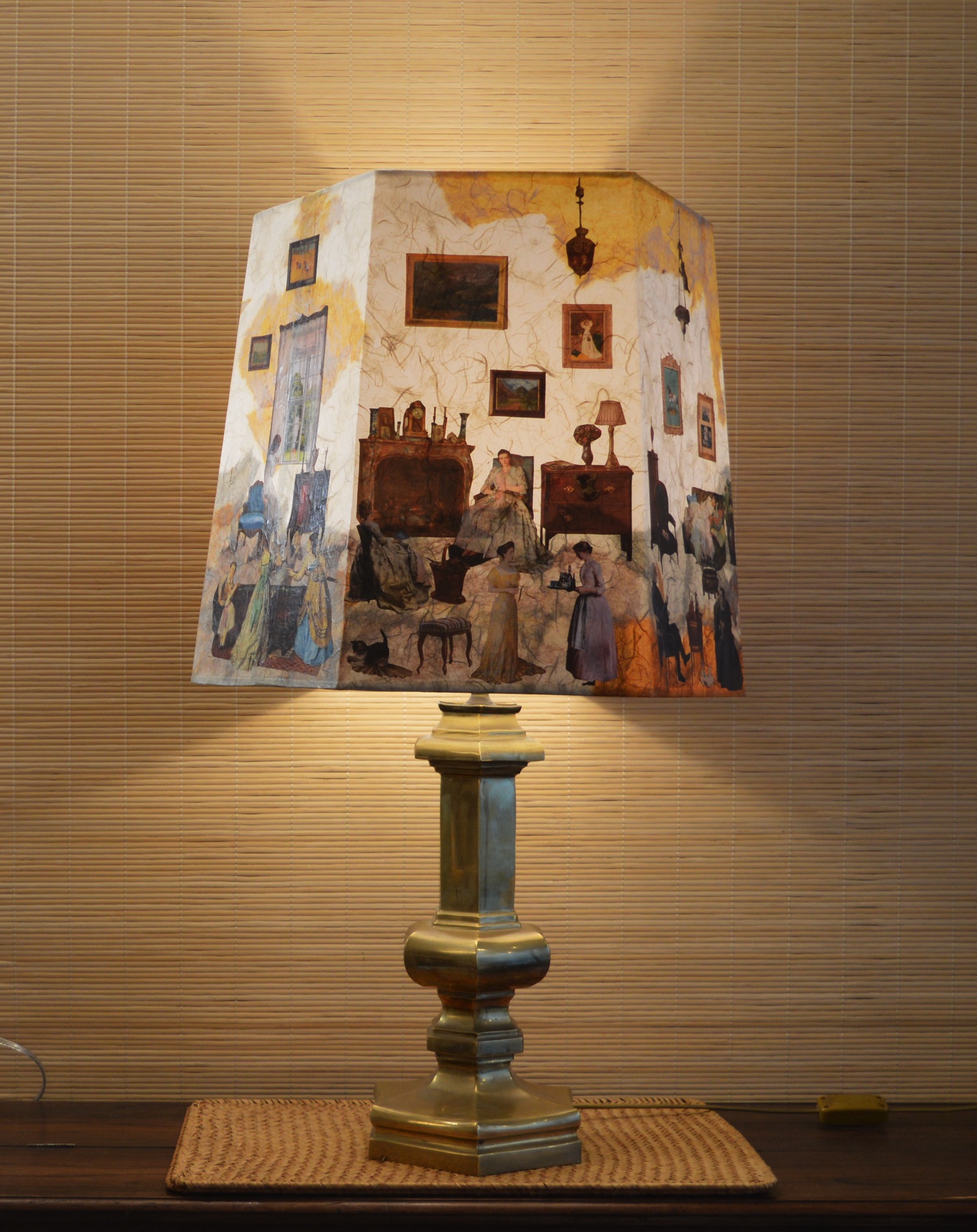 Grand abat-jour 6 pans qui représente six pièces de vie, la cuisine ou les gens de maison s'affairent,