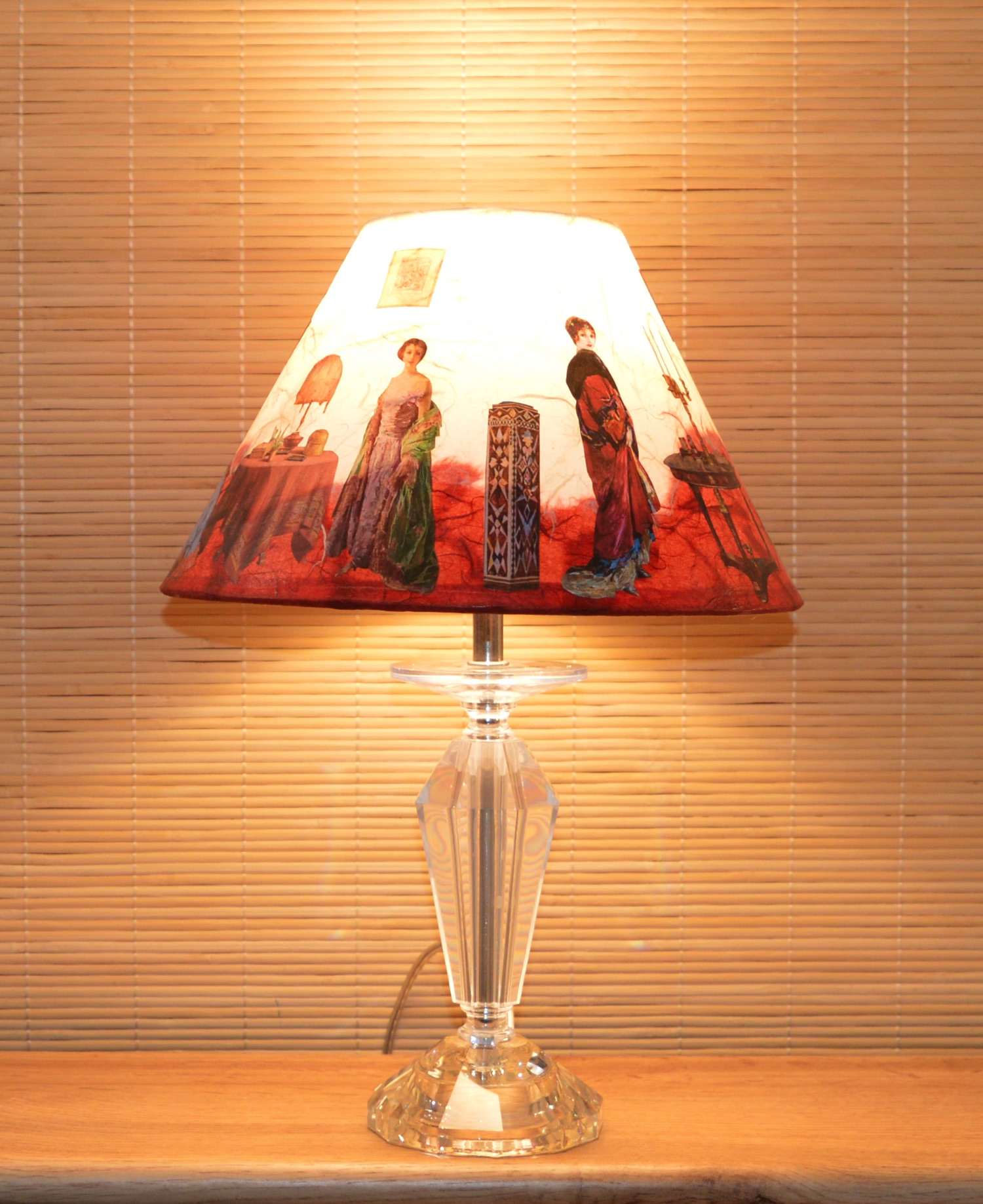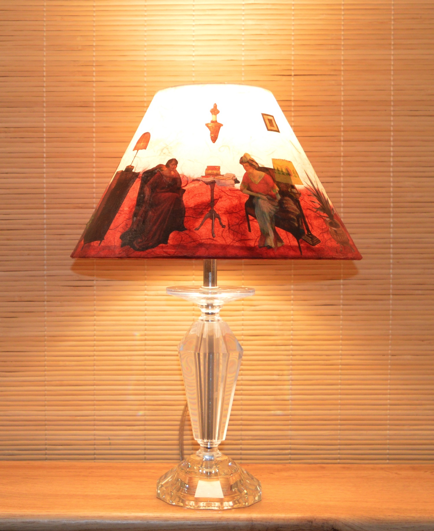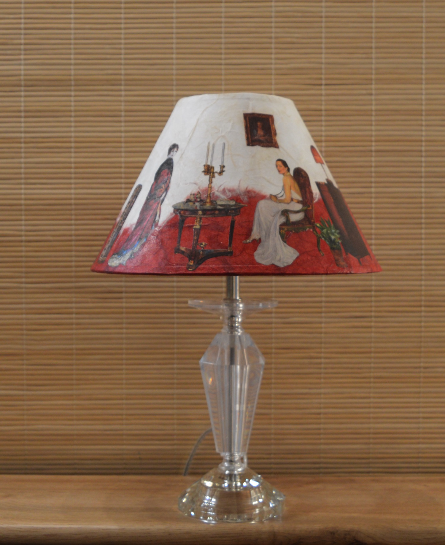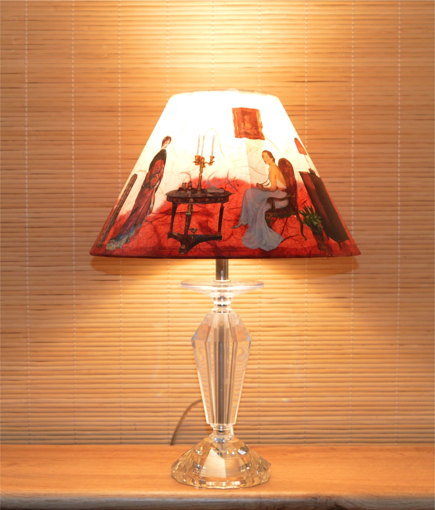 Sur cet abat-jour de forme conique, la scène raconte par le moyen d'extraits de peintures issues de tableaux de grands maîtres: