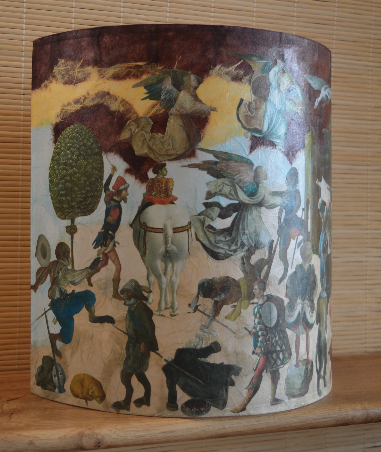 La technique employé est le collage, tant pour le fond en papier végétal que pour les impressions (décors, personnages).