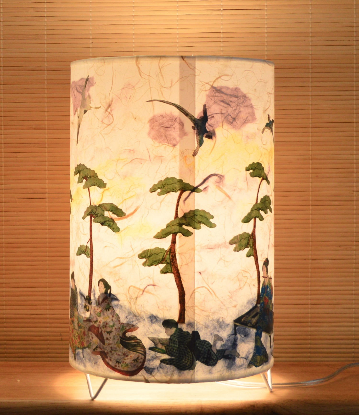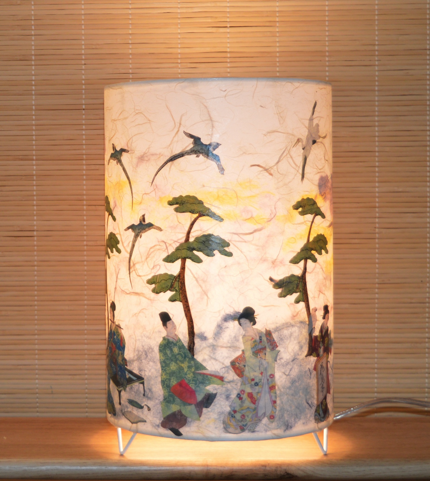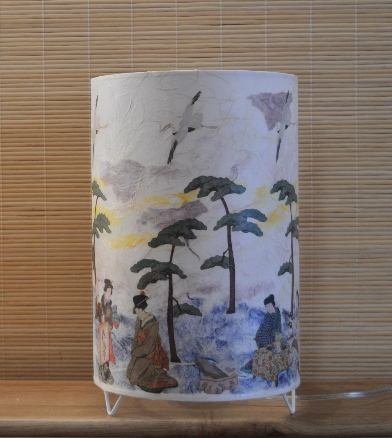 Bien être japonais. Ce petit abat-jour sur pied, orné d'estampes japonaises, évoque une atmosphère énigmatique et contemplative. Les représentations de femmes et de mères, placées en harmonie...